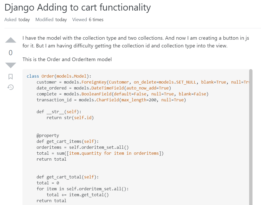 This is an example of a bad question. I found it in the recent questions, and just by looking at it there are some aspects that Raymond would find troubling. First off, the title sucks. “Adding to cart functionality” does not concisely portray the problem and is much too vague. Secondly, the question itself has way too much text. The user does summarize their question to a debatably acceptable level in the actual post (trust me I’m the authority here, I have 214 reputation points), but then proceeds to post three long pages of code instead of a “minimal test case”. A minimal test case is an illustration of the problem, just enough code to exhibit the undesirable behavior and no more. This crazy lunatic is clogging up the form with his console.log statements. Now that is just plain lazy (but hey what do you expect, the user only has 1 “reputation” point and is a “new contributor”). Thirdly, I would like to mark him down on the simplicity of the actual question. He is essentially asking how to pass data from the front-end using javascript, to the back-end (which uses python). This is a very common procedure and Django (the web framework he is using) has some of the best documentation out of any framework I’ve ever seen. I know for a fact some web surfing and document surfing would find him the answer. This is not an original problem that warrants a blog post on stackoverflow. RTFM. STFW.