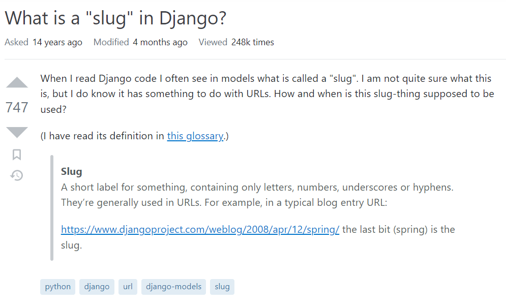 This is an example of a good question. This is a theoretical and intuitive question which I think is a great question to ask people with experience (and apparently the community does too, up-voting it 747 times). Design decisions can’t be found in the manuals and depending how niece, can’t be found in textbooks either. It is great to ask the pros “I know how this is done, but why do you do it, and why wouldn’t you do it”? Additionally, the title is short and concise and conveys what the person is asking. The question itself gets straight to the point and asks with a “what does this feature do for us developers and consumers” tone. He also clearly states his level of understanding by linking the Django definition of “Slug”. This shows he did some background research in the appropriate place: the manuals, and has still come short of an answer to his question. I would personally give this question a thumbs up, because I remember learning about slugs and didn’t understand why they’re more beneficial to use versus an integer in the URL that is merely incremented. There are user readability and security reasons they are used to generate dynamic webpages, which is not immediately evident for beginner web developers.