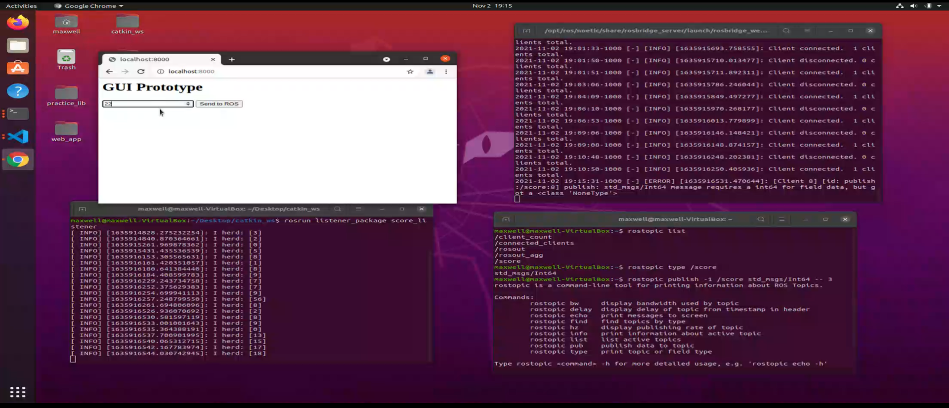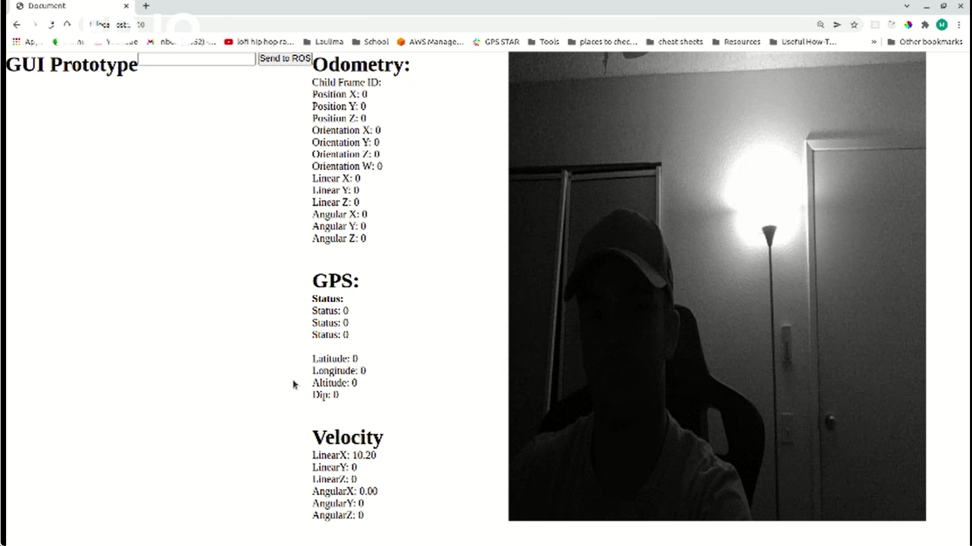 Below is an image of various ros nodes running, necessary to enable the ros network to communicate with the web based frontend. Here the pilot of the rover can pass data through the web browser, which is received through a web socket on a ros node. This is a simple integration test which merely displays the data passed over the browser.